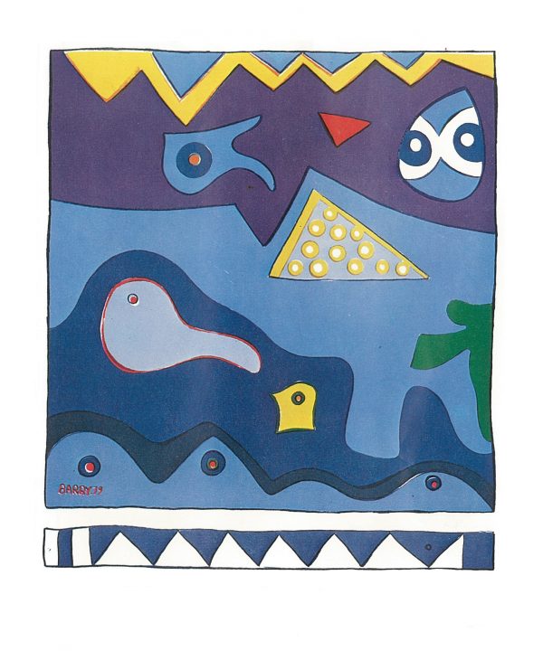 Zia-folket og dets skabelsesberetning Af Michael Lykke Andersen Barry Lereng Wilmont er canadier, men med en grafisk og en kunstnerisk uddannnelse har han valgt Danmark - og især det indre København som bosted - selv om han ofte opholder sig i endog meget fremmede dele af verden. Trods det har man i Kunstklubben kunnet følge ham igennem mange år. Og set hvordan hans arbejde har udviklet sig voldsomt, selv om det altid har været myterne, der har været hans fundament. Rødderne til dette billede går både tilbage til 1987 og til 1991. Og Barry Lereng Wilmont mener selv, at han med de fortællinger, han har lagt bag billedet, nu er ved at nå vejen rundt. Han fortæller selv: - I 1987 var jeg i New Mexico for at finde frem til sandheden om Zia-indianernes skabelsesberetning. Jeg havde hørt om den her og der, men ville gerne selv danne mig et indtryk af sandheden. Zia-befolkningen (alt det med stammer er noget andre har tillagt indianerne, de betragter sig selv som lande og folk, fordi de har fælles sprog og fælles historie) er efterhånden reduceret til omkring 600-700, og en vil formentlig snart uddø. - Men jeg var så heldig, at man i den by jeg besøgte, kendte en gammel kvinde. Jeg fortalte hende, hvad jeg vidste. Hun skar en masse udenomsvrøvl væk, og tilbage var Zia-indianernes egentlige skabelsesberetning. - Det fantastiske er, at den rummer en forudsigelse: At solen en dag vil begynde at brænde som tusinde sole. Og det skete faktisk i 1944, da man i nærheden foretog verdens første atomprøveforsøg. Barry Lereng Wilmont lægger ikke selv andet end det umiddelbart synlige i legenderne. Han ønsker ikke at fortolke dem ind i nutiden eller at forsøge at belære. Hans ønske har altid været at få de gode historier og fortælle dem, samtidig med at han lod sine tanker få frit spil på lærred eller papir. - Oprindelig var Zia-folket stort, og sammen med de nærliggende Zuni-indianere havde de en stor kultur. I 1540 kom spanierne dertil med hærlederen Vaques Cononado. Men i stedet for at slå dem ned, som man havde planlagt - kong Karl den 5. af Spanien mente nemlig at her lå de syv gyldne byer med guld på fortovet og ædelstene på tagene - så indgik man en fredsaftale med de to stammer. Ikke at kongen havde tænkt sig at holde den. Blot to år senere sendte han en langt større hær på 1100 veludrustede soldater op for at slå stammerne ned. Men det lykkedes langtfra. Soldaterne nåede til Rio Grande, men blev slået på flugt. Dernæst havde Zia'er og Zuni'er fred i deres hovedby Yugeingge i 50 år, inden en hær under ledelse af Juan de Onades indtog byen. Han kaldte den San Gabriel de Yungue og floden Rio Grande. Barry Lereng Wilmont fremhæver, at Zia-indianerne havde en helt særlig status. De færdedes frit på hele det nordamerikanske kontinent. I 1989 var han selv ved Peel-floden i Yucon-distriktet i Canada, hvor han var tilsluttet Canadian Rangers patruljen. Og her mødte han lokale, der kendte Zia-indianernes skabelsesberetning. - Men Peel River var også noget andet. Efterhånden har man jo fundet ud af, at det er folkevandringerne, der har skabt de indianske samfund, vi kender. De første indianere kom fra Sibirien via Beringstrædet for 3.500 år siden. Folkevandringen endte først i Canada og siden i Grønland. Men indianerne stoppede ved Peel floden - for lige syd for den kom indianerne fra en anden kultur, der var vandret op sydfra. De to kulturer kunne absolut ikke sammen. Blandt inuit'er kaldtes de sydlige indianere Grech'in - dem, der lever i fare. De kunne ikke gå op i Yucon-distriktet uden at risikere livet. Det fantastiske for Barry Wilmont er, at arbejdet med at spore indianerne - hvor Zia-legenden er central - til sidst førte ham til indianerne på det europæiske kontinent. Nemlig på Orkney-øerne. Her var amerikanske indianere udvandret til, og det lykkedes Wilmont at komme i forbindelse med dem. - Det er halvblodsindianere, der har giftet sig ind i familier, og så er rejst tilbage. Men det var fantastisk på Orkney-øerne at se indianerne, der i den grad lignede dem, jeg havde snakket med i Nordamerika. For mig var det som en ring, der blev sluttet. Barry Wilmont har beskæftiget sig med mange typer myter og legender siden starten af 1960'erne. Herunder Beowulf kvadet, der har sin oprindelse i Northhumbria i England, hvor det blev nedskrevet i 900 tallet og det blev fundet i British Museum af den dansk forsker i 1786.