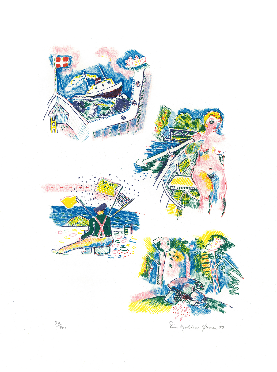Af Hanne Abildgaard. Maleren og grafikeren Finn Hjortskov Jensen havde en håndværkeruddannelse bag sig, før han besluttede sig til for alvor at bruge sin energi på billedkunsten. Han er udlært tømrer og glad for den praktiske baggrund. - Det er under alle omstændigheder vigtigt at have lært at bruge værktøj. Men det er ikke altid sjovt at bruge værktøj på andres betingelser. Arbejdet som håndværker er jo bundet, og det kan være meget godt, men efterhånden som elementbyggeriet vandt mere og mere indpas, oplevede jeg det som en degradering af mig som håndværker. Jeg ville simpelthen ikke være med til at producere grimhed. Man kan sige, at min beslutning om at blive maler på den måde også var et politisk valg. I andres malerier fandt jeg liv og kraft til at fortsætte. Jeg oplevede, at et maleri kunne ændre min sindstilstand - at jeg efter at have været langt nede kunne hente kraft i kunsten til igen at møde verden åbent. Den oplevelse, at kunst giver liv, selv om kunstneren har været død i 400 år, at man kan pumpe liv og energi ind i en billedflade, gjorde mig nysgerrig og medførte, at jeg begyndte på Kunstakademiet i 1968. At generobre virkeligheden Vi der kom ind på akademiet dengang, stod i en ret umulig situation. Vi havde hele Cobra-gruppen og det abstrakte maleri som udgangspunkt. Men mange af os følte, uden at det skal forstås negativt over for det genstandsløse maleri, at vi ikke kunne komme videre ad den vej, og at folk i al almindelighed ikke rigtigt kunne bruge det til noget. Vi følte os som de første græsrødder. Det var os, der skulle prøve at generobre en tabt virkelighed - at generobre kvinden, barnet, landskabet i kunsten. Samtidig har det abstrakte maleri været meget betydningsfuldt på den måde, at vi der kom efter, kunne bearbejde virkeligheden på en ny og friere måde. Det var en sådan situation, der var baggrunden for dannelsen af gruppen "Violet sol«. Den startede i 1971, og jeg har været med i den siden 1972. Den startede ud fra en kreds, der havde gået hos Ejler BiIle. Han var gæsteprofessor på den tid og havde en overordentlig stor betydning for mig personligt.