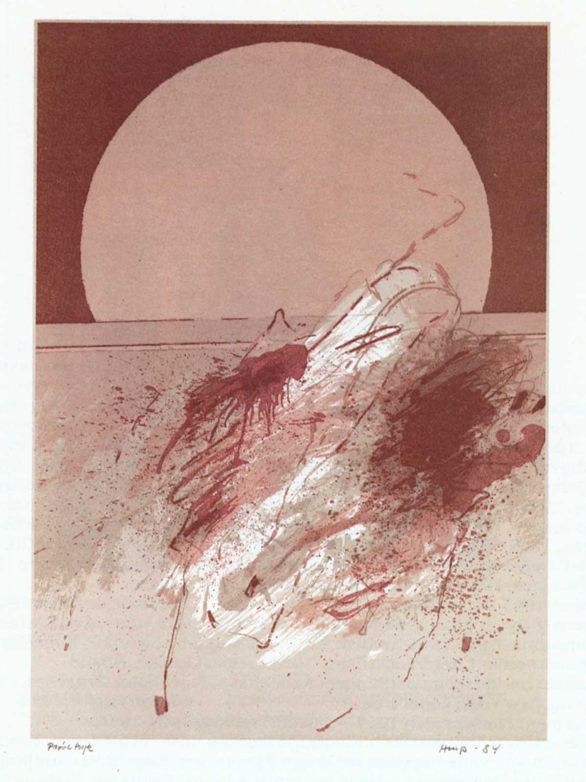 Men i den store firkantede flade er der farveeksplosioner af nuancer af den rødbrune farve blandet med den grå, som stænk eller som klatter eller blot som en sværm af prikker. Enkelte steder er der trukket streger, som sprænger horisonten og stiger op sammen med solen. Det kan have form som et kvindebryst og et mandligt lem. Så pludselig forandrer naturoplevelsen sig til en orgastisk oplevelse, som jo også er en ægte og oprindelig naturoplevelse. Ja, orgasmen er vel blot drømmen om livet.