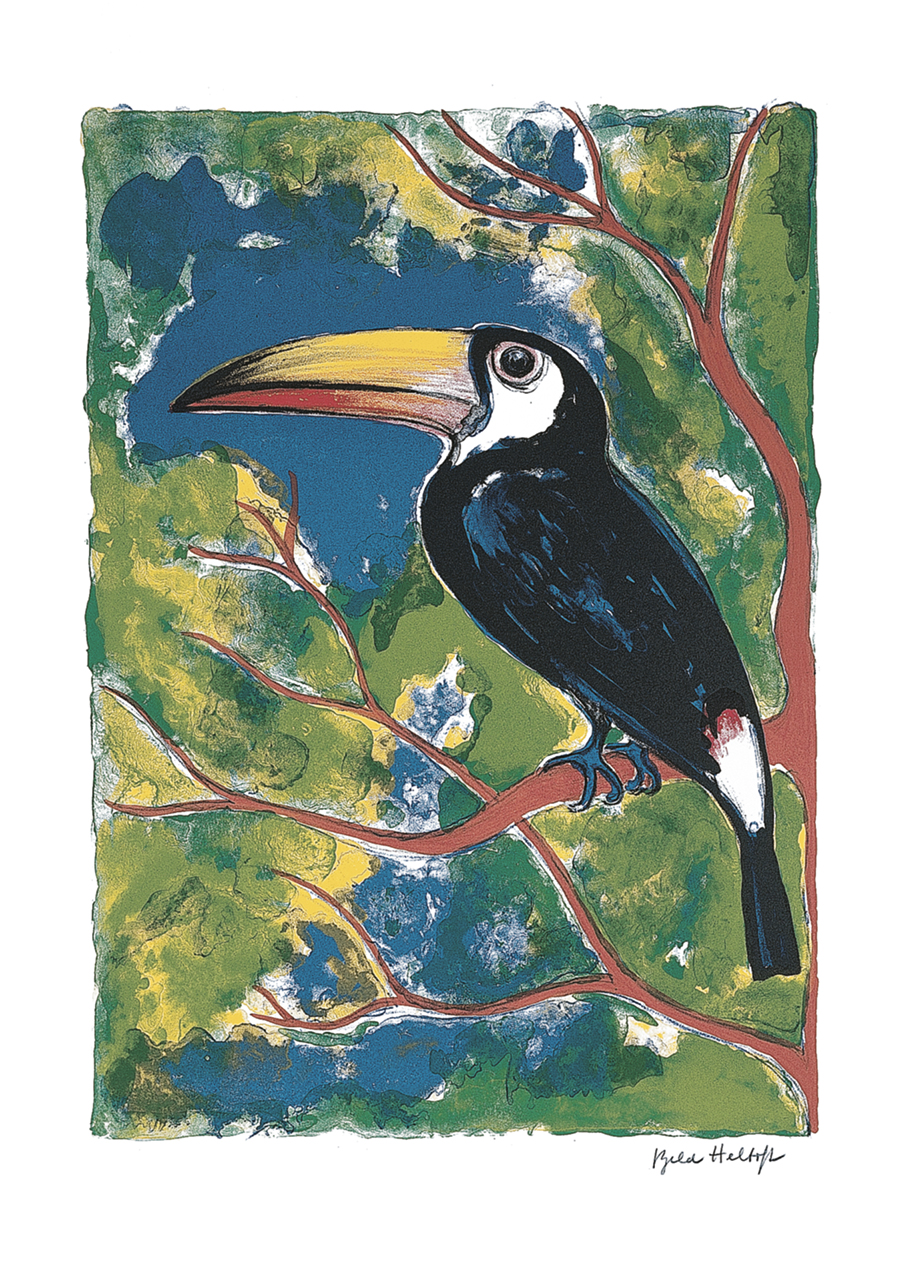 Når man laver kunst, vil man gerne fortælle om det, der optager én. Og det, der optager mig er levende skabninger: Menneskene, træerne, dyrene, fuglene... faunaen i det hele taget. Det vil sige alle de ting, som vokser og som kræver vækstbetingelser. Sådan har det altid været, siden jeg som 16-årig begyndte at tegne. Dengang var det træerne, dernæst fuglene og menneskene. Disse skabninger føler jeg mig beslægtet med og solidarisk med, og det betyder så igen, at genkendeligheden i synsoplevelsen spiller en vis rolle. Det er kærligheden til tingene, synsoplevelsen, jeg hengiver mig til, og det kan folk lide. Tukanen hedder jo også en Peberfugl, fordi den lever af peberfrugter oppe i trækronerne i sydamerika. Det som har optaget mig ved den er det utroligt barokke, der er ved det kolossale næb, som iøvrigt er meget let. Det er helt luftfyldt, og hornet som bærer næbbet består af ganske tynde plader. Det vejer ikke så meget som det ser ud til. Jeg synes, Tukanen er en fascinerende fugl. Mennesket kan jo ikke opfinde så barokke skønheder, som dem der findes i udformningen af skabningerne. Det har jeg altid været mere tiltrukket af, end hvad jeg selv kunne finde på af mærkelige fantasier. Jeg tror ikke på, at man i sin fantasi kan finde på at skabe så mærkelige fugle som Tukanen og Træskonæbbet... prøv at tænke dem allesammen igennem, siger Kjeld Heltoft. Motiverne til sine billeder finder han først og fremmest i naturens mangfoldighed, og af samtalen med ham, da Kunstklubben udbød hans litografi med Træskonæbbet, fremgik det, at han ikke havde det fjerneste imod at arbejde for miljøorganisationer. – Jeg vil næsten sige, at det er det, jeg allerede gør. Jeg føler meget for miljøorganisationer og i det hele taget græsrodsbevægelser, der kæmper imod en kortsigtet økonomisk udnyttelse af omgivelserne, sagde han dengang.