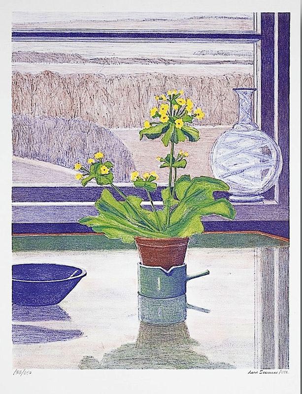 Blomsten bliver og er det egentlige, og alt det andet er blot noget uden om. Den blanke lyse bordplade, landskabet, selve vinduet, glasskålen, flasken og skålen med urtepotten tjener kun til at afsløre blomstens myldrende liv af former og farver. Det er den, det drejer sig om. Den er det eneste virkeligt levende i billedet. Den lille, stille, sagtmodige, uprangende blomst får billedet til at leve på trods af de stive former, på trods af det nøgne landskab - på trods af den vinter, som ventes inden længe med kulde og sne.