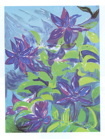 For en kunstner skal der mod og bevidsthed til for at gå i gang med blomstermotiver. Og for disse tre litografier - hvor de to er holdt i orange farver mod det grønne og det ene i det meget vanskelige blå op mod det grønne - bliver motiverne til alt andet end banaliteter og svælgen i farver. Her bliver det pludselig til lidenskab og styrke, i den måde de kraftige farver spiller ud mod hinanden på, og i de magtfulde rytmer bladenes og blomsternes placering i firkanten skaber. Som en forfriskende vind blæser gennem blomsterbuskene og -bedet. Og pludselig bliver motiverne levende og svajende, samtidig med at vi godt ved, at motivet holdes fast i kunstnerens disciplinerede jerngreb.