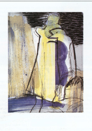 Men dette er ikke brød eller kage. Det er et billede, et litografi, hvor to blå flader dominerer. Den ene ligger vandret i bunden og er gjort med store penselstrøg og vandfarve, den anden flade har i sine lodrette linjer og penselstrøg form som en tung noget uformelig krop. Den blå skinner også med i de store tætte gule flader og i de grå flader blandet op med en svag okker. Med sort oliekridt er figurerne eller motivet trukket hurtigt op - øverst til højre er vandrette tykke tætte streger som sten i en mur eller glitter i vand.