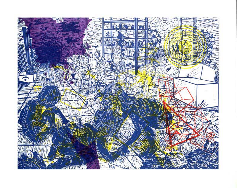 Professor, maler og grafiker Ole Sporring, er mester for dette linoleumssnit, »Børnehave«. Det har en del år på bagen, og naturligvis har kunstneren været i bevægelse i tiden, siden det blev til - men der er en tråd, en sammenhæng. Engagementet i menneske og samfund er usvækket.