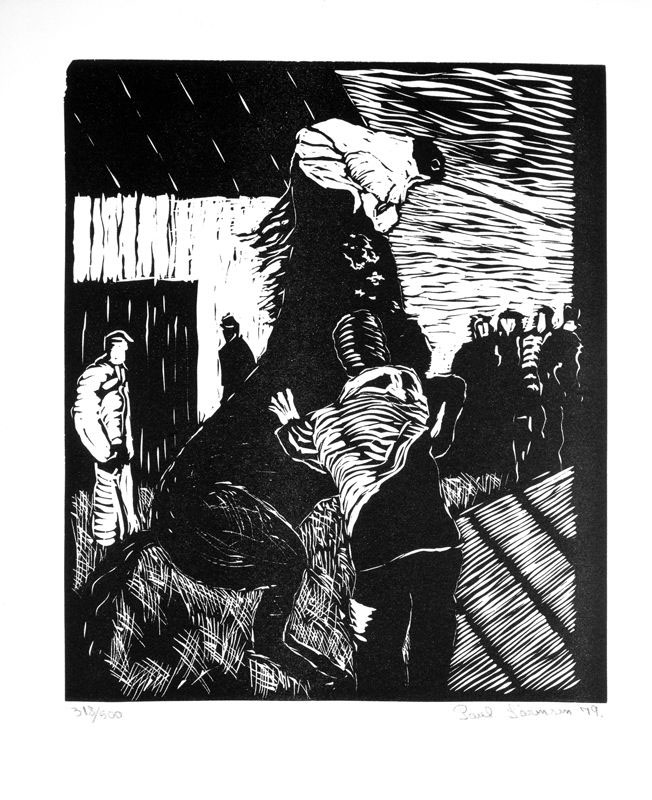 Maleren og grafikeren Poul Sørensen har i sit sort/hvide linoleumssnit fanget en situation fra folkefornøjelsen, Hjallerup Hestemarked.