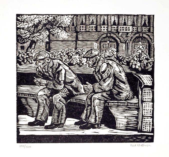 Også dette tryk har illustrationens præg og stemning. En inderlighed i tonen og en nærhed i perspektivet fra den store lysende flade ved mændenes fødder over bænkens sorte ryg til den let skårne mørke monumentale flade i baggrunden. Motivet er helt naturalistisk: To gamle mænd sidder på en bænk i egne tanker og slikker en smule solskin på pladsen foran Århus Domkirke. De er omgivet af frodige levende vækster - blomster og et enkelt træ.