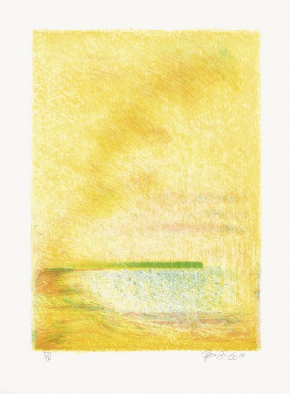 - Det udspringer af nogle indtryk, der ligger en del måneder tilbage, da jeg oplevede molen ved Tisvilde i en kraftig storm, der fik bølgerne til at stå ind over den. I første omgang førte det til en række malerier, hvori de grå farver var dominerende. Malerierne blev solgt på min udstilling i Den Frie, og på en måde var det vel oplagt at gå videre i samme spor i litografiet. Men pludselig fikjeg lyst til at lave det hele modsat. Farven lagde jeg helt over i gul - en neapelgul med en cromgul oveni, hvorpå jeg tegnede molen ind med blå. Det grå stormbiIlede var forvandlet til en varm sommerdag med en kontrastfarvet mole.